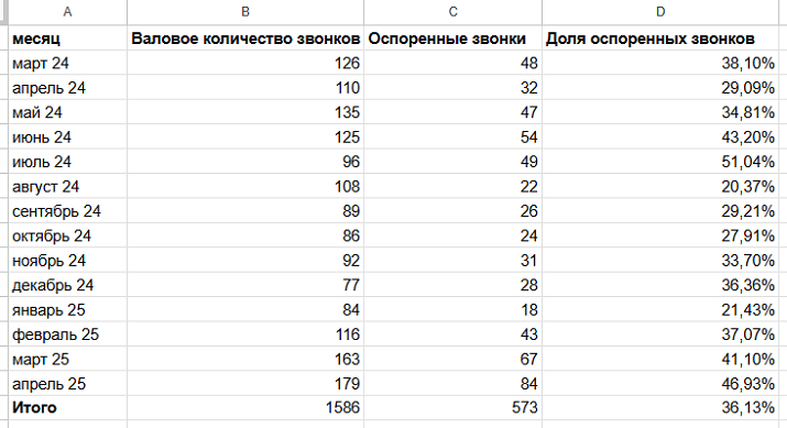 По одному из регионов с марта 2024 по апрель 2025 мы получили с рекламных площадок 1586 звонков. И смогли оспорить 573 обращения, а это 36,13 % от общего количества звонков. Цифра внушительная!