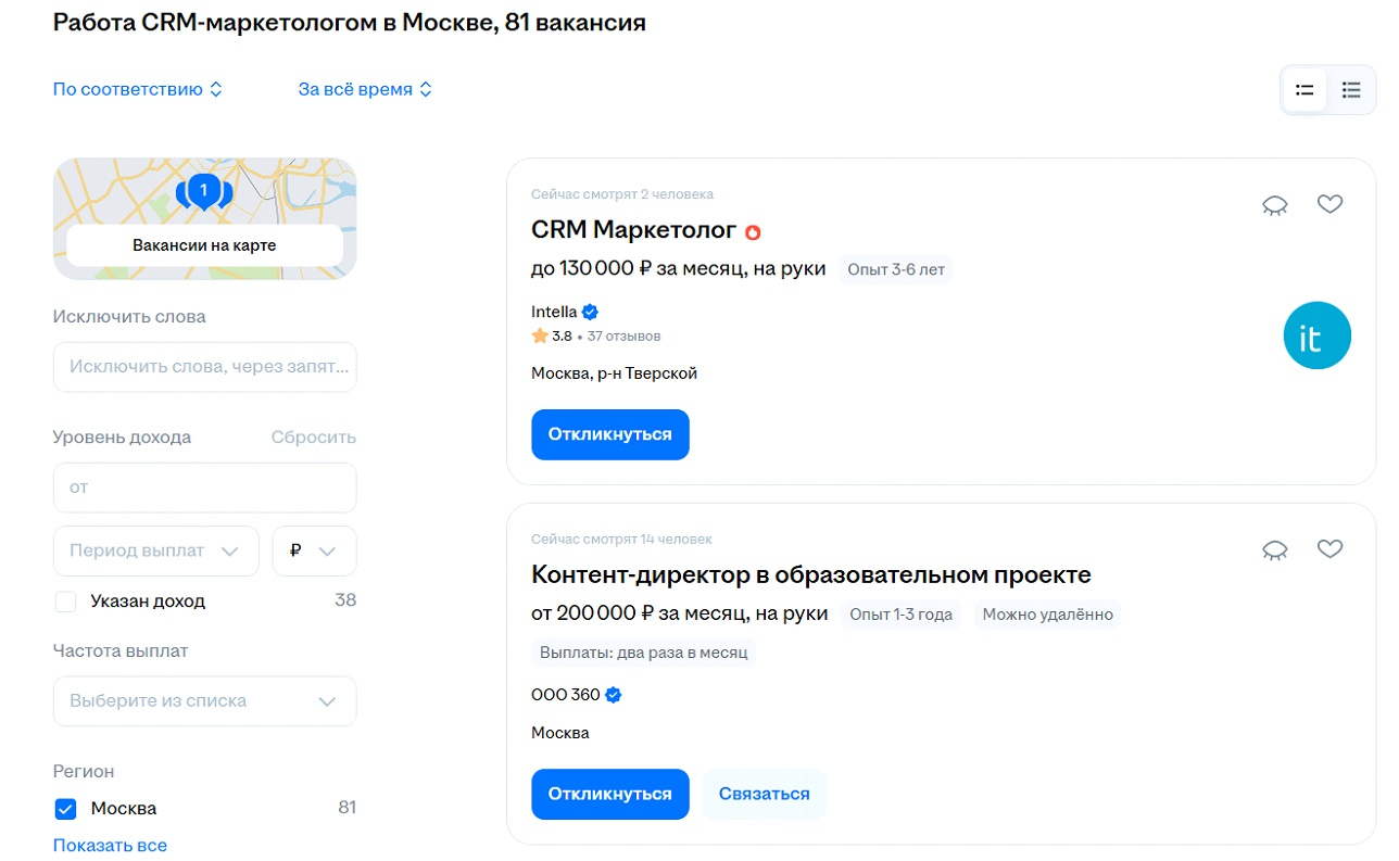 Часто клиенты делятся сложностями при найме сотрудников. Во-первых, CRM-маркетологов на рынке труда по-прежнему мало. На ноябрь 2025 года по Москве была найдена всего 81 вакансия CRM-маркетолога. Для сравнения, вакансий копирайтеров было 1760.