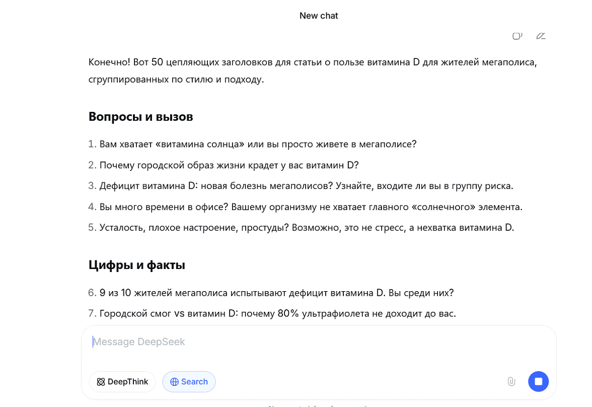 Практический пример: маркетолог дает ИИ задание: «Напиши 50 вариантов цепляющих заголовков для статьи о пользе витамина D для жителей мегаполиса». Из 50 вариантов эксперт выбирает 3 наиболее удачных, дорабатывает их, добавляя личный опыт и авторитетные ссылки на исследования, и использует для запуска рекламных объявлений.