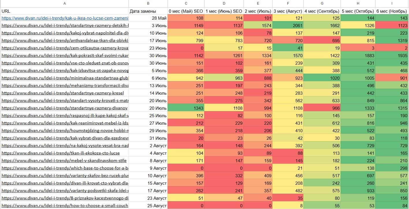 Таким образом мы снимаем показатели трафика, позиций, отказов раз в две недели и сравниваем разницу между текущими и прошлыми данными.