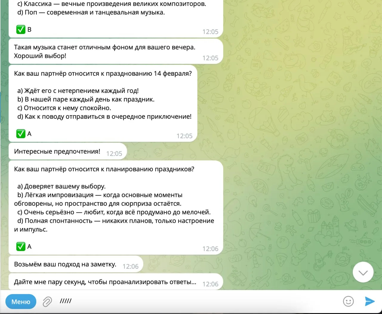 Концепция была такова: пользователь отвечает на серию вопросов о предпочтениях своей второй половинки (активный отдых или уют, итальянская кухня или азиатская, сюрпризы или планирование). На основе ответов бот анализирует данные и выдает персональную рекомендацию — готовый сценарий праздника.