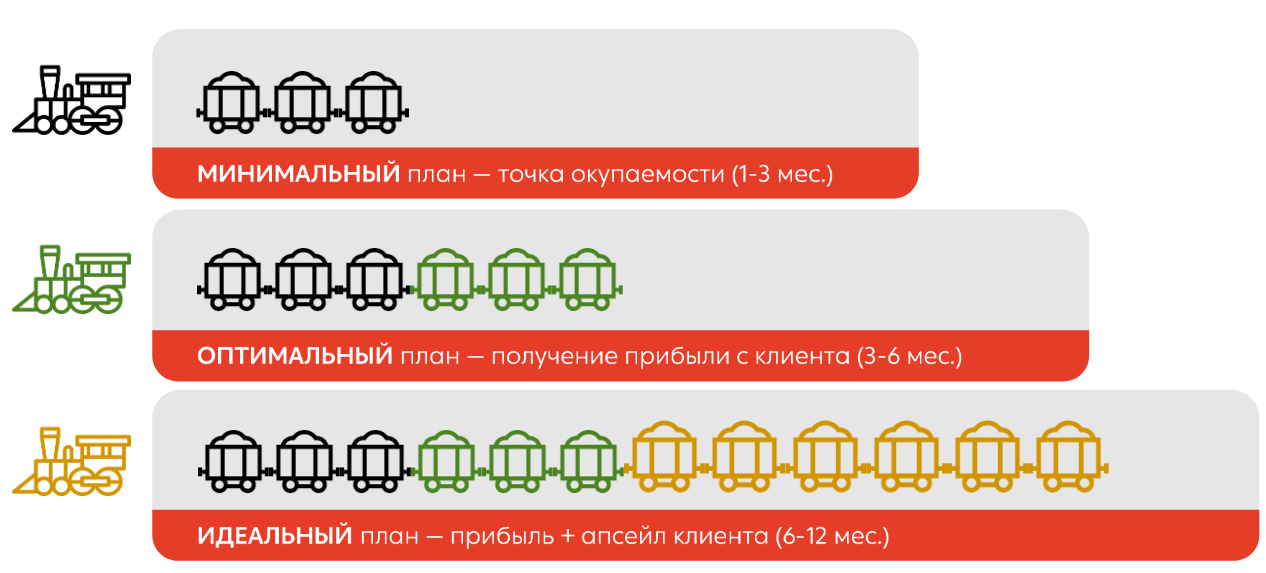 Привлечение клиента стоит денег. Эти вложения нужно окупить: для этого в среднем нужно, чтобы он купил у нас 3 раза. Да, это похоже на среднюю температуру по больнице и все зависит от ниши, продукта, маржинальности и так далее. Но усредненно это выглядит именно так: 3 сделки, чтобы окупить стоимость привлечения.