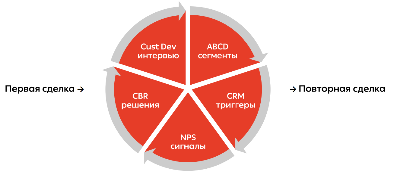 Когда интервью, сегментация, CRM-автоматизация и обратная связь работают вместе, возникает цикл повторных продаж: