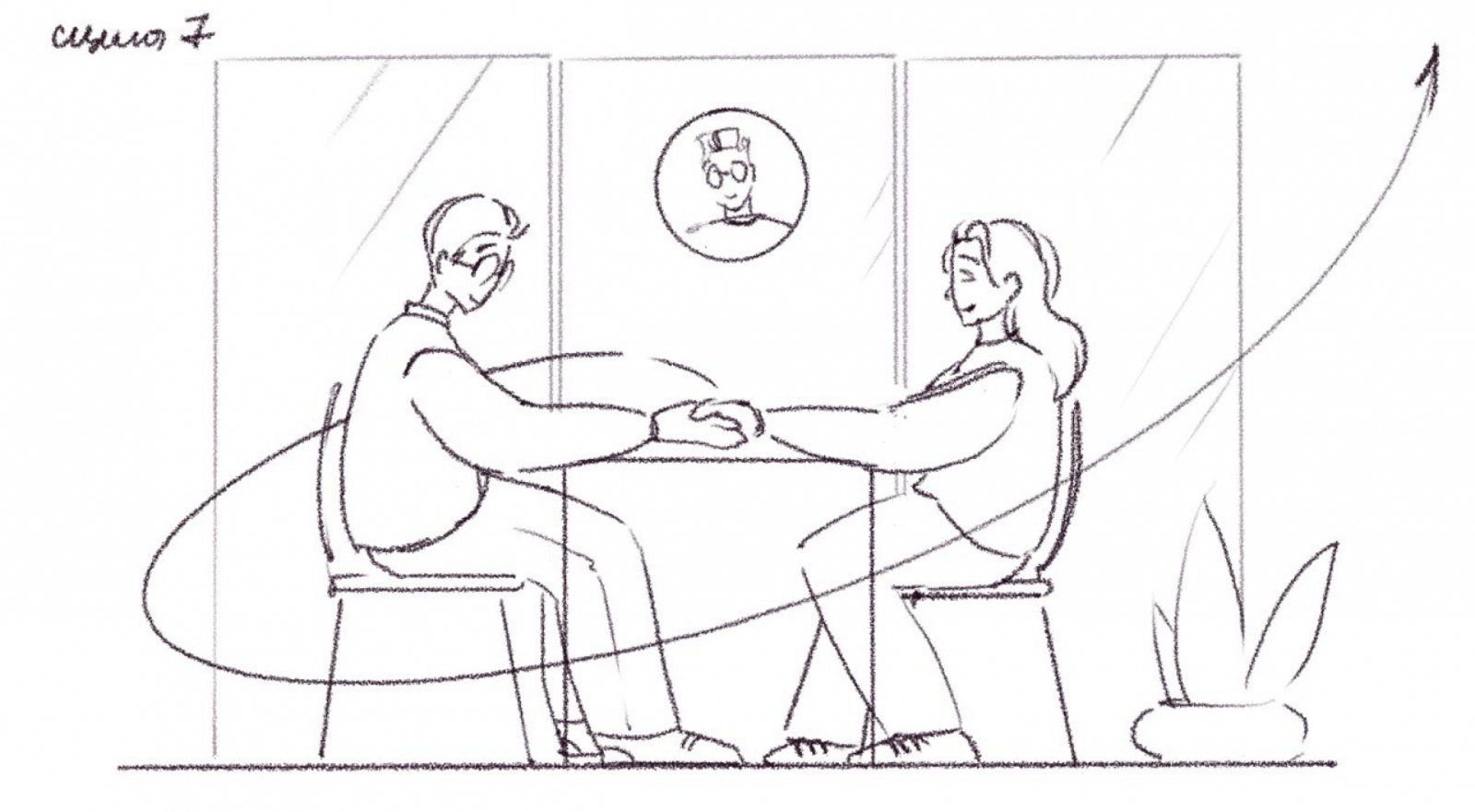 Придумали сценарий и написали текст закадрового голоса, описывающий сюжет и действия. Параллельно приступили к отрисовке скетчей, которые послужили основой для будущей раскадровки. Создали дизайн для персонажей, фона, иконок и инфографики.
