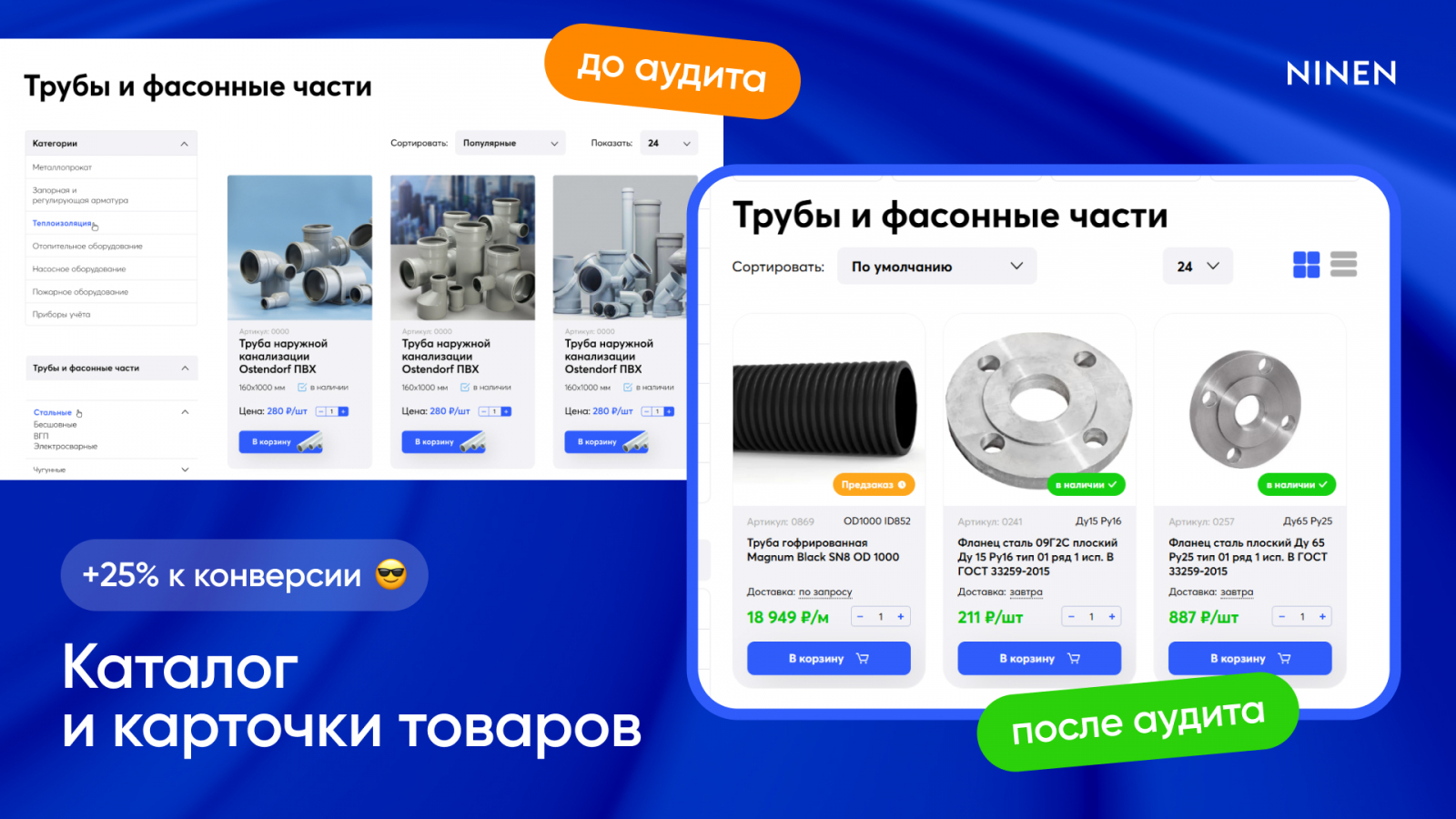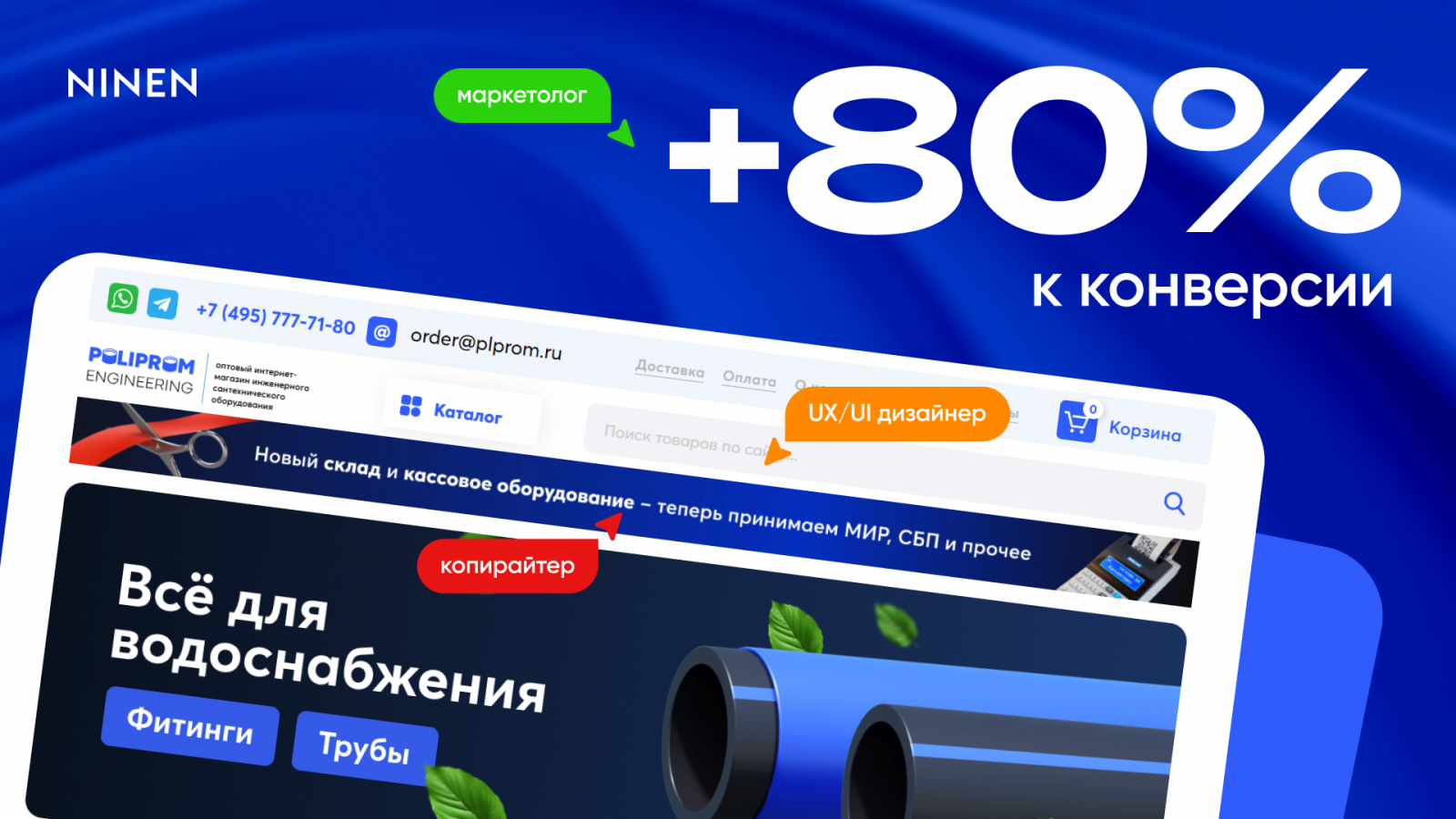 Причём мы сами же и разработали интернет-магазин Полипром Инжиниринг для продажи инженерной сантехники с фокусом на крупные оптовые заказы: создали для заказчика мощный инструмент онлайн-продаж, минимизировали ручную обработку заявок, интегрировали сервисы оплаты и управления клиентскими базами и провели пострелизный аудит, увеличив конверсию продукта x3.