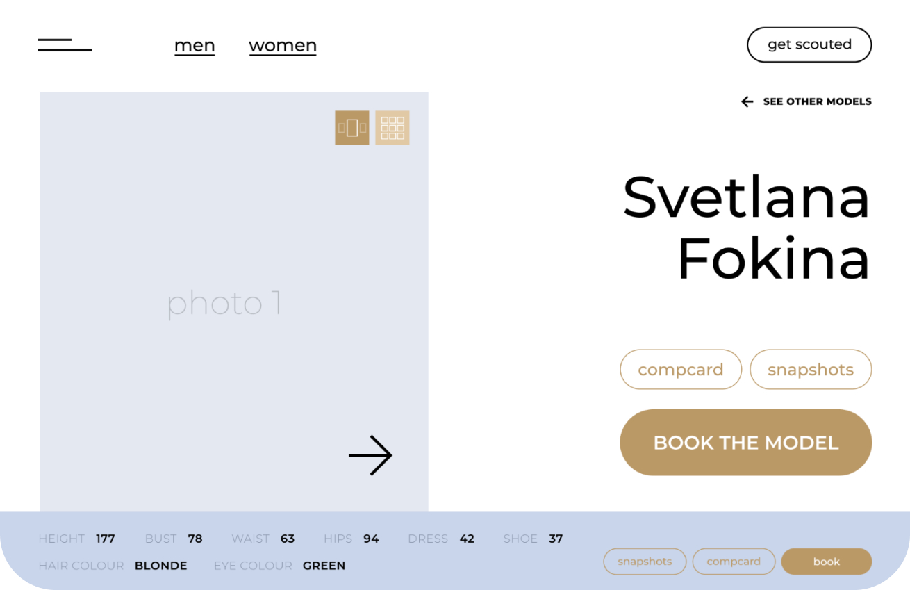 Это конечная точка выбора, поэтому на ней много UX-механик, которые удерживают пользователя в просмотре портфолио и при этом не ломают путь к заявке. На первом экране карточки модели реализовали: