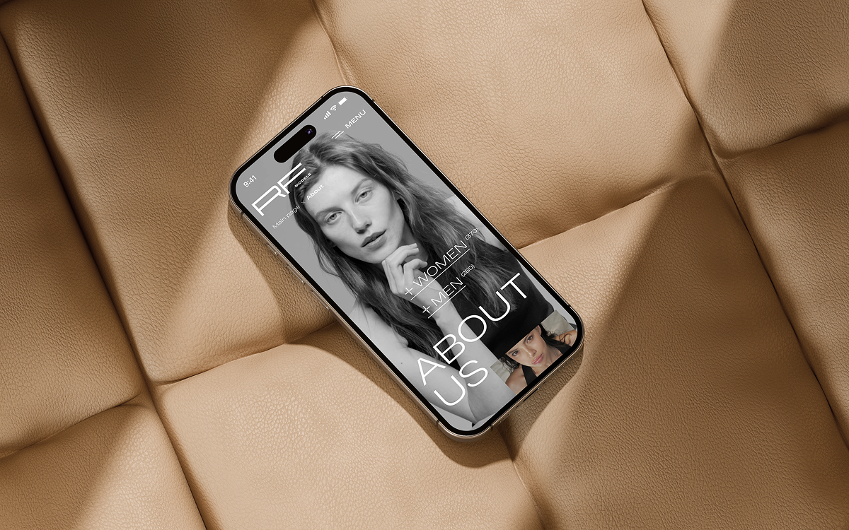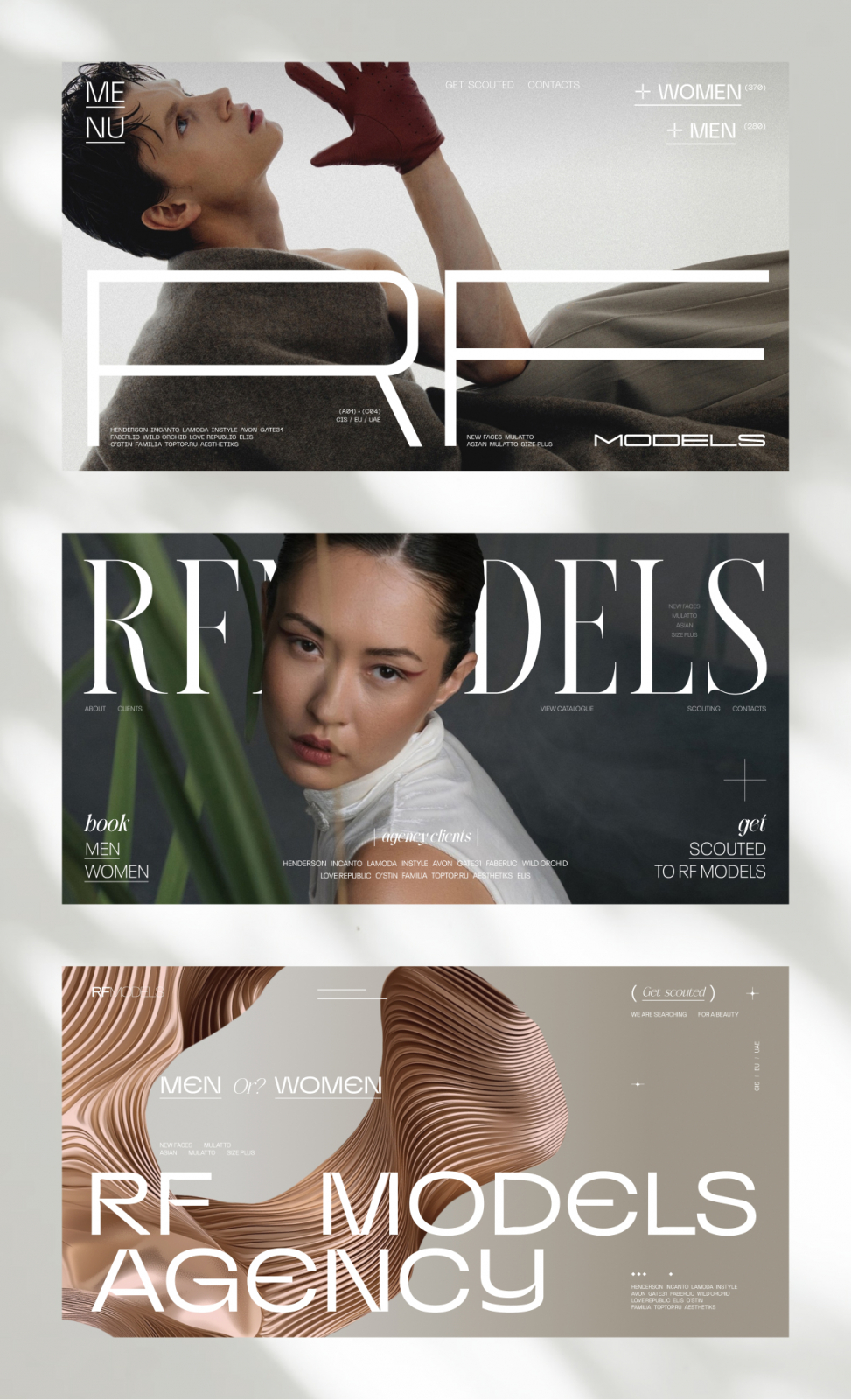 В этом проекте дизайн первого экрана был не просто красивой обложкой. Он должен был стать визуальным кодом всего сайта и сразу отвечать на главный вопрос клиентов RFMODELS: «уровень соответствует?». В нише, где у заказчика, его менеджеров и их клиентов есть вкус и насмотренность, просто хороший дизайн не работает. Нужно было сделать стильно и привлекательно, но не потерять конверсионность.