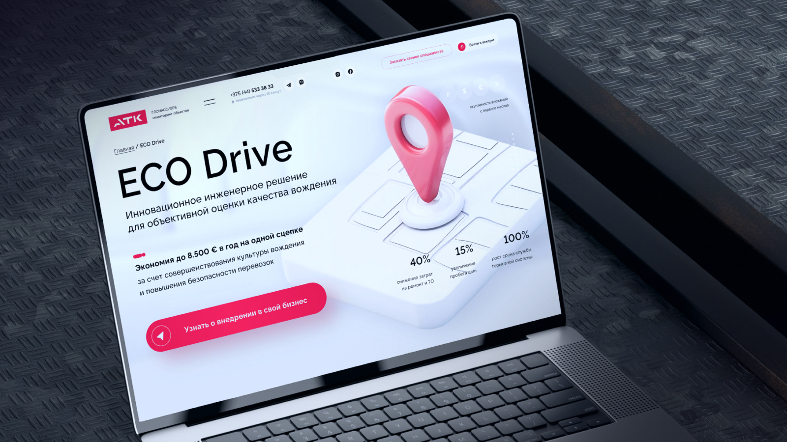 Аудит бизнес-логики / анализ болей B2B-клиентов / выявление точек экономической ценности: топливо, простои, дисциплина водителей, прозрачность данных. Пересборка архитектуры / сценарий «проблема → решение → механика → экономический эффект → контакт» / главная страница как управляемая воронка. Выделение ECO Drive в самостоятельную стратегическую ось / усиление роли инженерной аналитики / смещение фокуса с оборудования на управляемость автопарка. Разработка технологичного визуального стиля / строгая типографика / системная графика / акцент на цифрах и аналитике / минимализм без визуального шума.Инженерная frontend-реализация / оптимизированная архитектура проекта / адаптивная логика интерфейса / производительность под высокой графической нагрузкой / стабильная работа на мобильных устройствах B2B-аудитории.