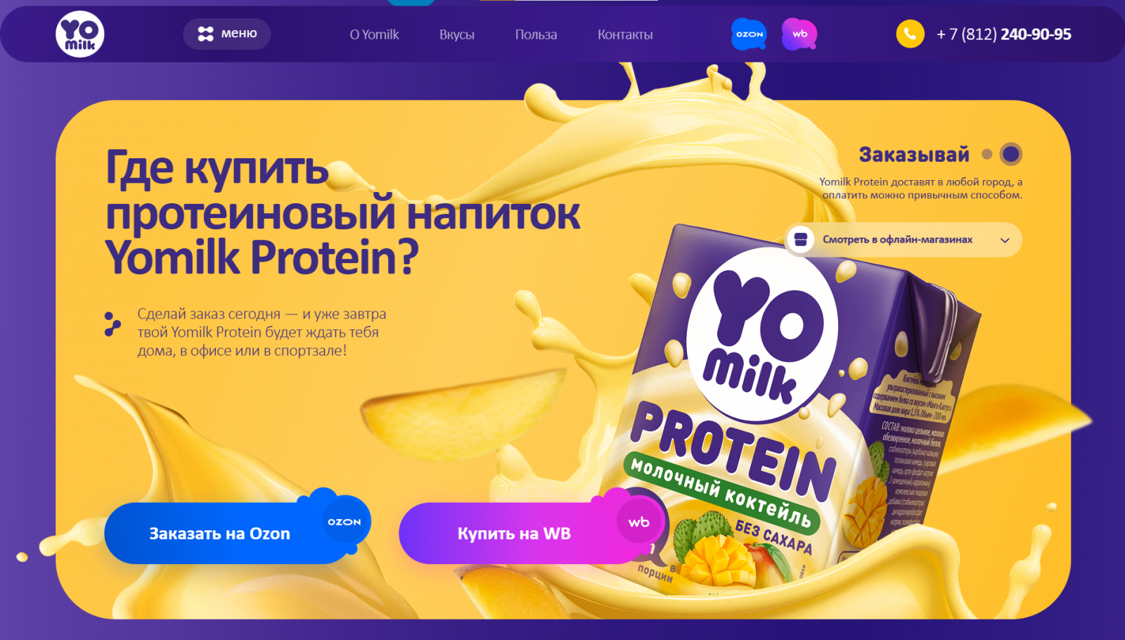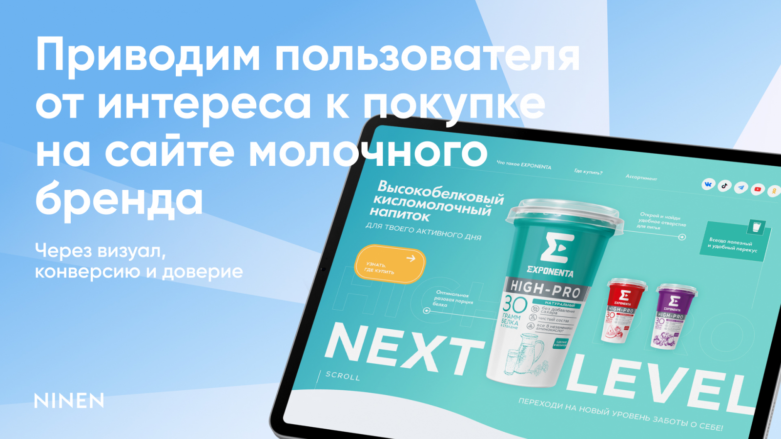 Здесь задача сложнее. Продукт новый для рынка: протеиновый коктейль, который нужно одновременно объяснить B2C-аудитории и дистрибьюторам. Важно было быстро вызвать интерес, донести состав и при этом не попасть ни в «спортпит», ни в классическую молочку.