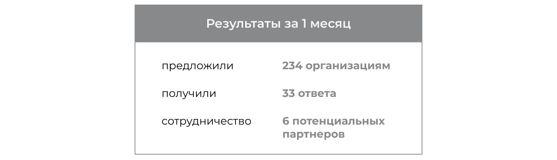 Для потенциального сотрудничества были отобраны мультибрендовые магазины, книжные магазины, библиотеки, музеи, арт-пространства, сетевые компании из разных сфер (общепит, бьюти, ИТ). В результате мы получили 6 потенциальных партнеров, с которыми в данный момент ведутся переговоры.
