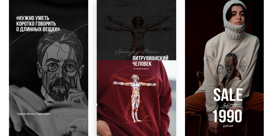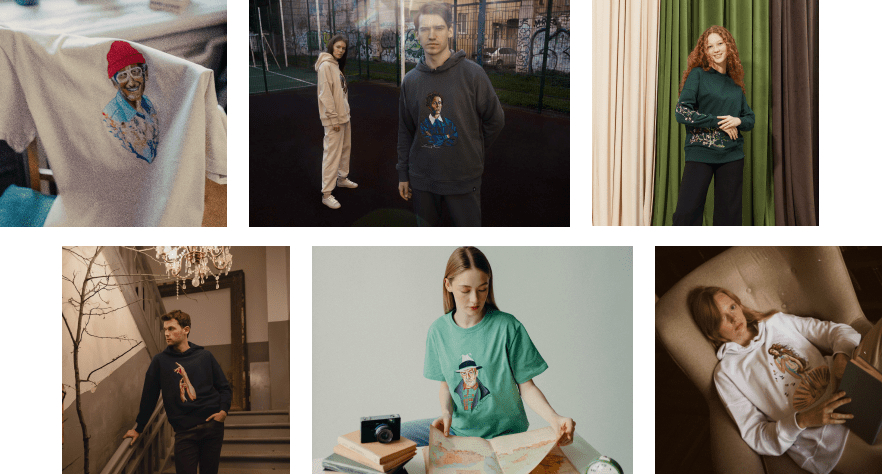 Визитная карточка бренда — коллекция вышивок, состоящая из портретов значимых писателей, художников, ученых и других людей, изменивших мир; а также фрагментов известных картин.