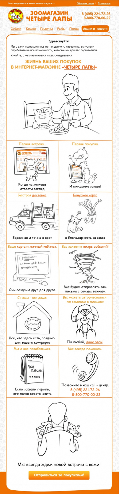 Например, в приветственном письме для «Четырёх лап» мы составили визуальный рассказ о работе магазина и выгодах для подписчиков. Получилось интересно и эффективно: Click-through rate — 25%.