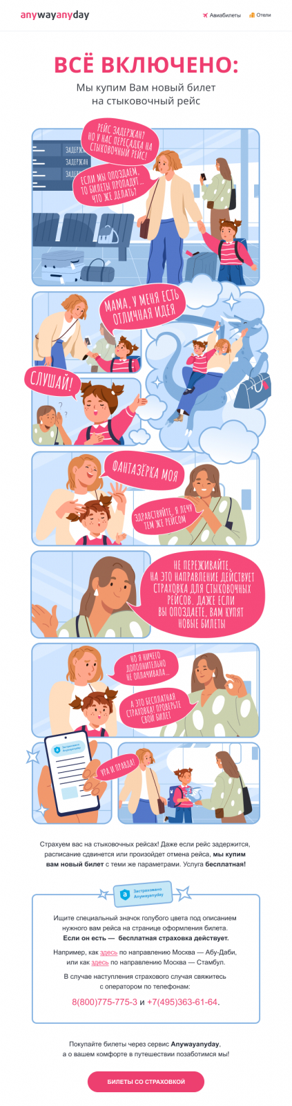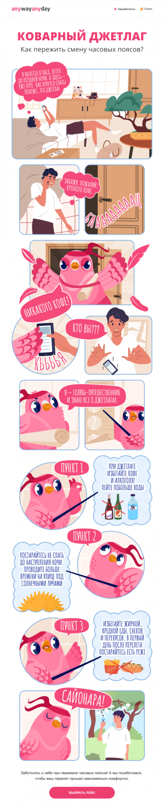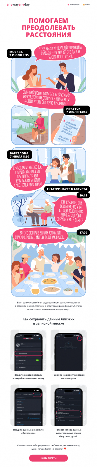 Вот наше письмо для туристического сервиса Anywayanyday, которое выиграло в конкурсе Email-Competitors Awards. Здесь мы донесли выгоду через реалистичный и живой сюжет, который глубоко вовлекает читателя.