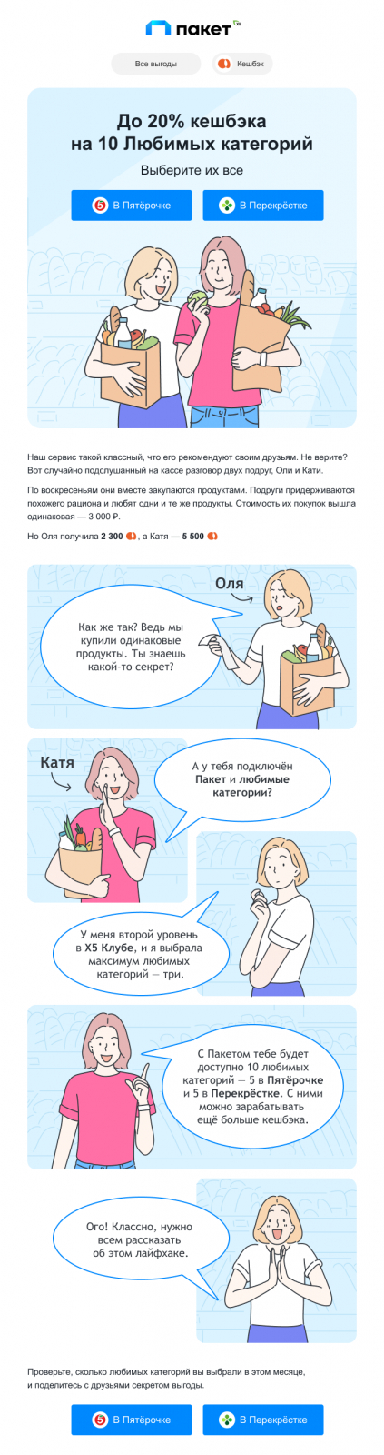 Сервис «Пакет» от X5 Group поддерживает лёгкий и понятный tone of voice и предпочитает явные CTA в своих рассылках. Была задача добиться этого и в креативах с комиксами.