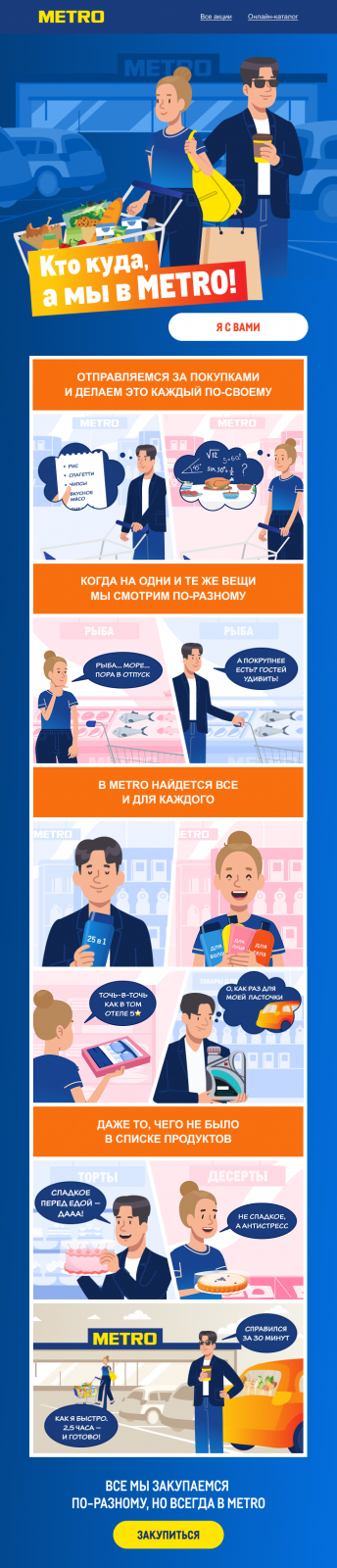 Сюжетную линию не обязательно делать линейной. Можно организовать комикс как серию коротких сцен: каждая иллюстрирует отдельную ситуацию, но все объединены общей темой. Такой приём мы использовали в продающем письме METRO к 23 Февраля и 8 Марта.
