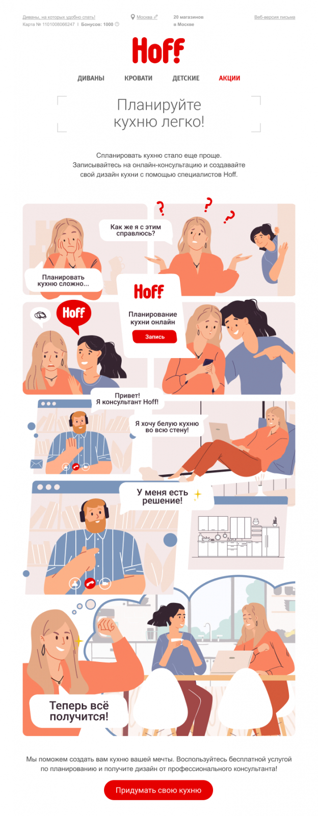 Незаменимая классика — заходить в коммуникацию через боль клиента — прекрасно вяжется с концепцией комикса. Сеть гипермаркетов Hoff выбрала именно такую стратегию для своих рассылок.