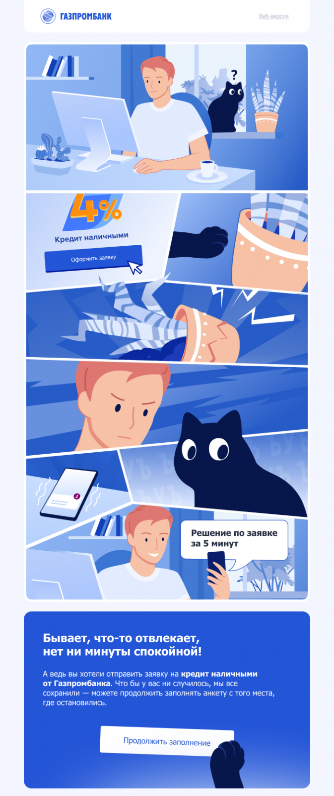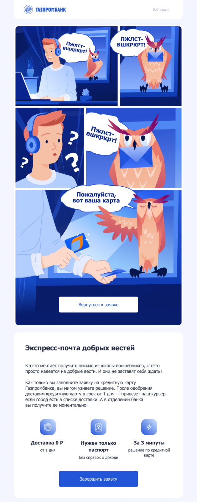Сюжет не обязательно должен быть из реальной жизни — вымышленные истории тоже прекрасно работают. Это на своём примере подтвердил «Газпромбанк», когда пришёл к нам обновить триггерные цепочки.