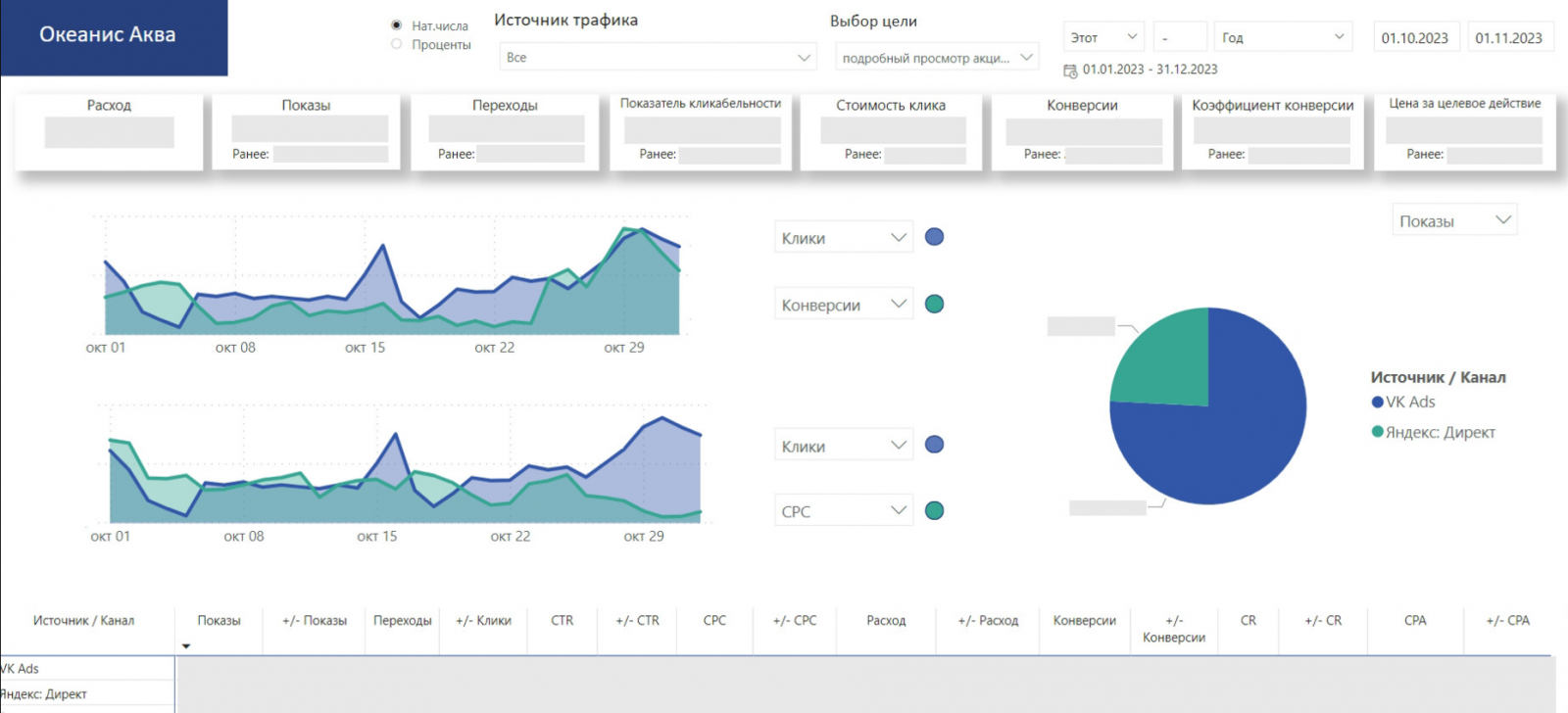 Для каждого проекта мы сразу делаем систему отчетности: готовим дашборды для учета расходов и системы аналитики в удобном формате для клиента. Отчеты базируются на Power BI. Мы настраиваем отображение графиков по тем показателям, которые интересны клиенту. Хочет следить за бюджетом,сравнивать эффективность каналов или интересуется динамикой показов — добавляем нужные элементы, чтобы он смотрел их и не отвлекался на то, что ему не интересно.