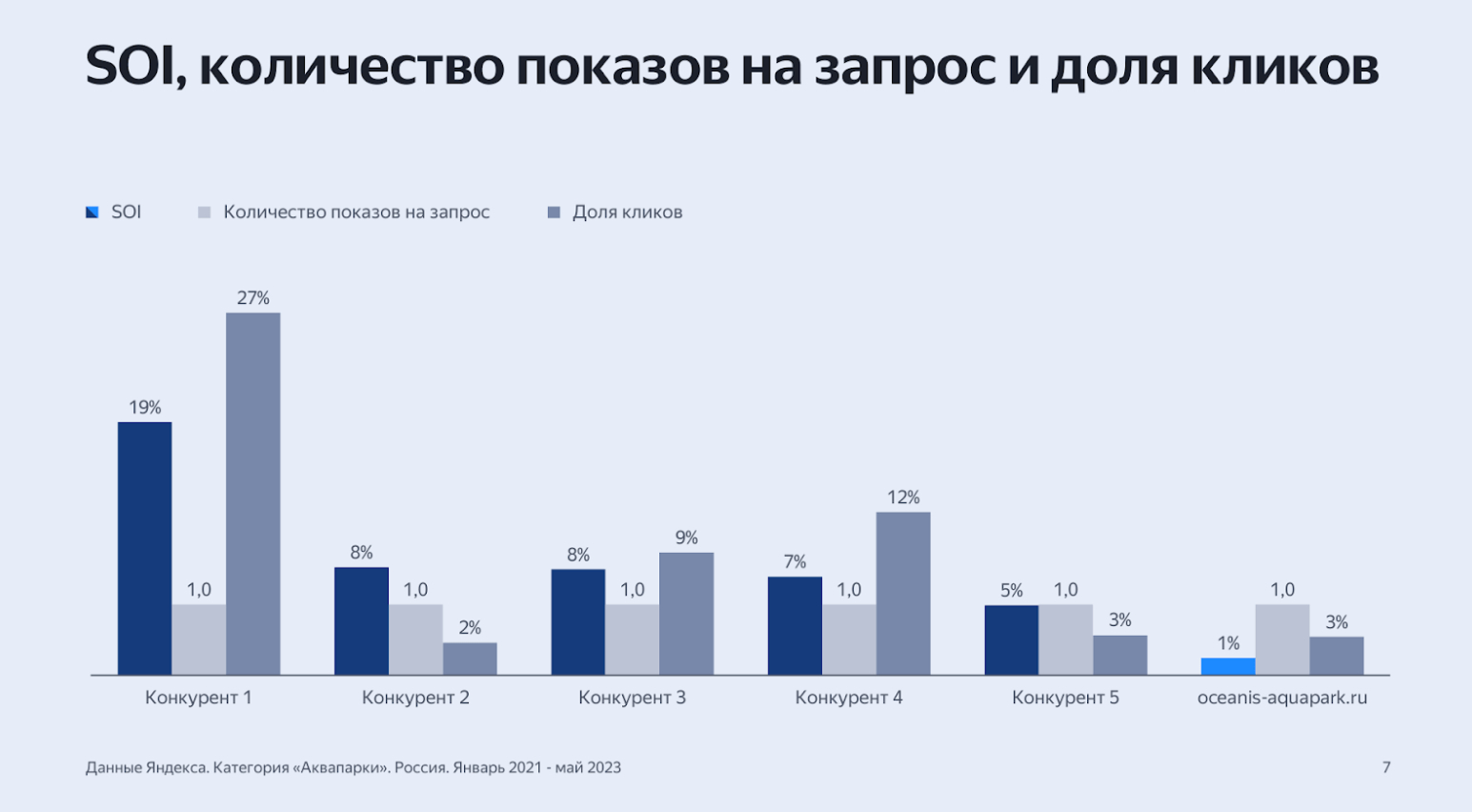 Мы заказали такую аналитику для аквапарка «Океанис» и комплекса «Океанис Термы». У аквапарка по сравнению с конкурентами был очень низкий показатель SOI — доли выигрышей в аукционах.