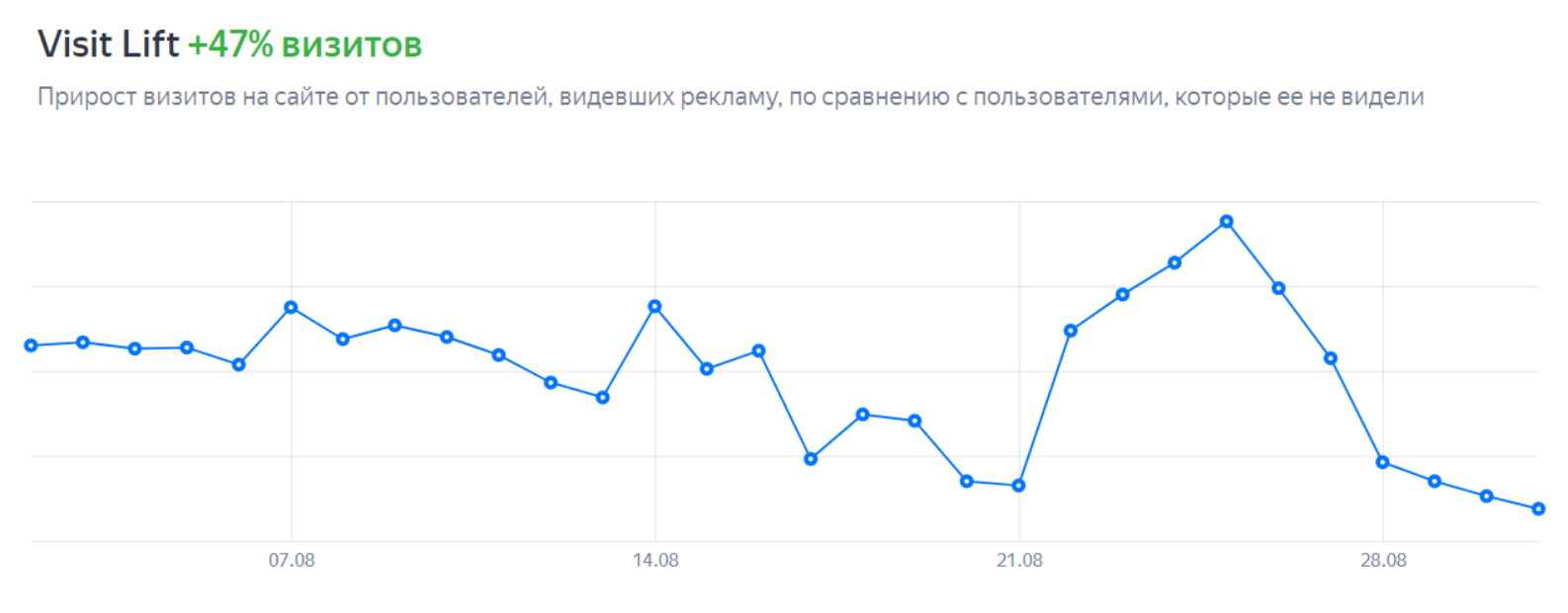 Провели Visit Lift — исследование, которое позволило оценить, как выросло число визитов на сайт после просмотра медийной рекламы. Рекламная кампания дала прирост на 47% визитов.