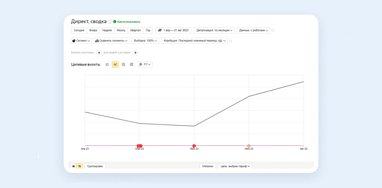Каждый месяц мы анализируем прошедшие кампании и ищем способы их оптимизировать, чтобы тратить меньше на неэффективные клики и получать больше конверсий в рамках бюджета. Добавляем новые баннеры, тексты и составляем план на следующий месяц.