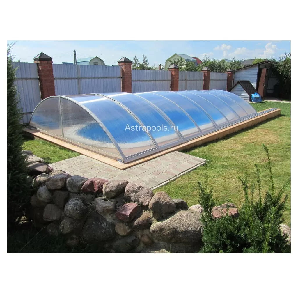 Если конструкция размещается близко к дому, ее часть можно прикрепить к стене строения. Количество секций зависит от размеров бассейна. Предусмотрена одна или несколько дверей, позволяющих зайти в закрытый павильон.