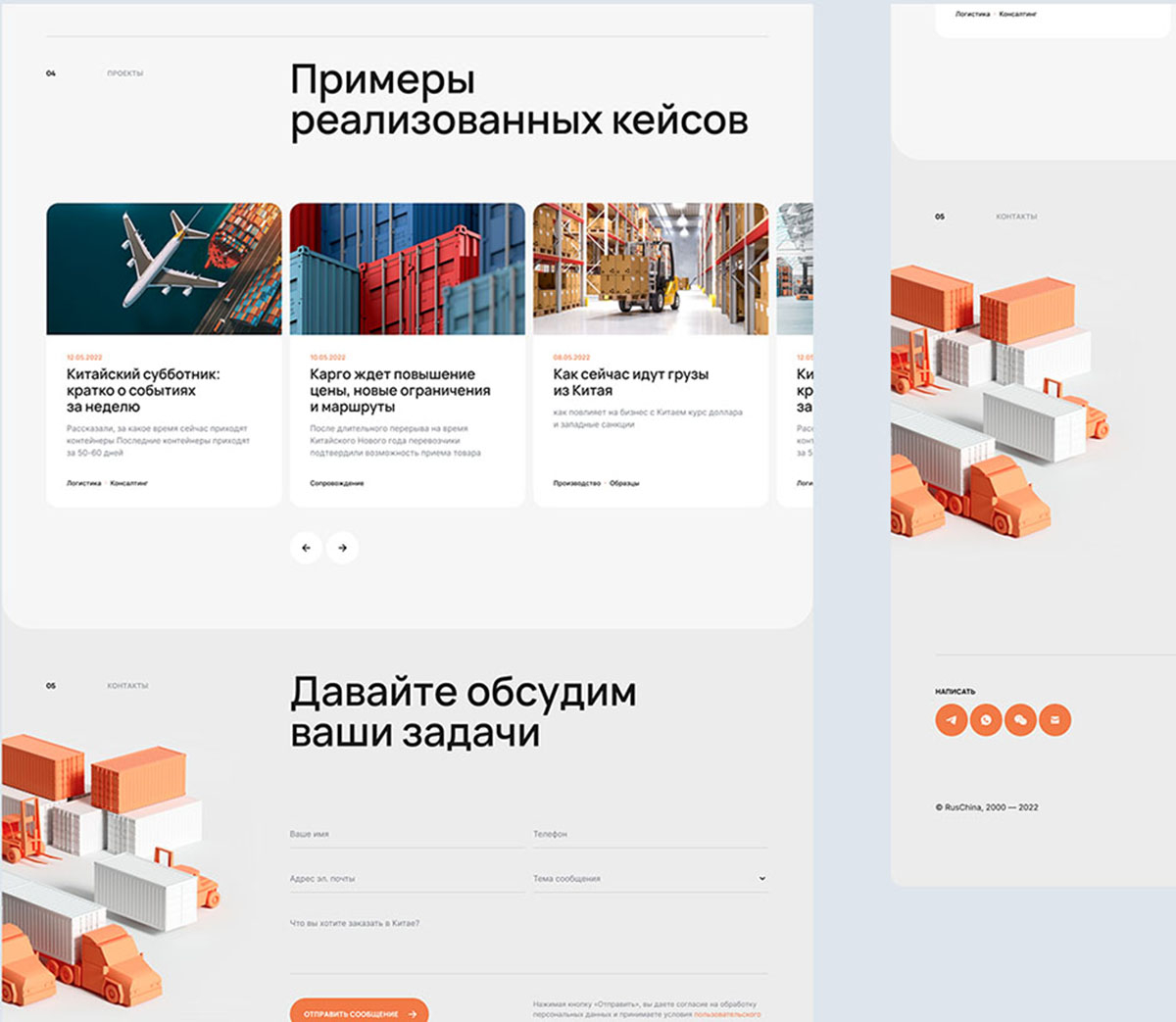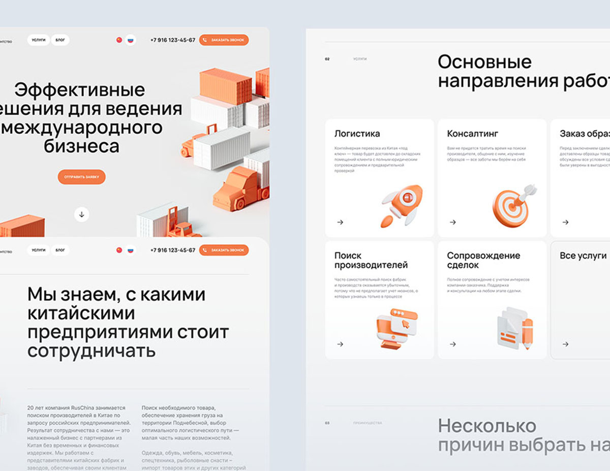 Основным цветом был выбран оттенок кораллового — переходный цвет от красного к желто-золотому. Это решение символично: в китайской традиции оба цвета означают достаток, процветание, богатство и удачу, что еще раз подчеркивает глубокую экспертизу компании и качество услуг. Скругленные углы создают приятную атмосферу.