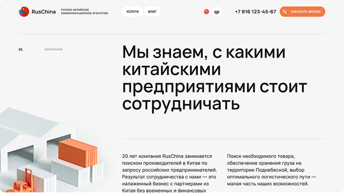 Сделать сайт для «Русско-Китайского Коммуникационного Агентства» — компании, которая многие годы занимается поиском и подбором надежных китайских поставщиков для клиентов из России. Сайт не обновлялся более десяти лет (!) и требовал глобального перезапуска с учетом нового витка актуальности российско-китайского сотрудничества и увеличения целевой аудитории, которая ищет партнеров в Китае.