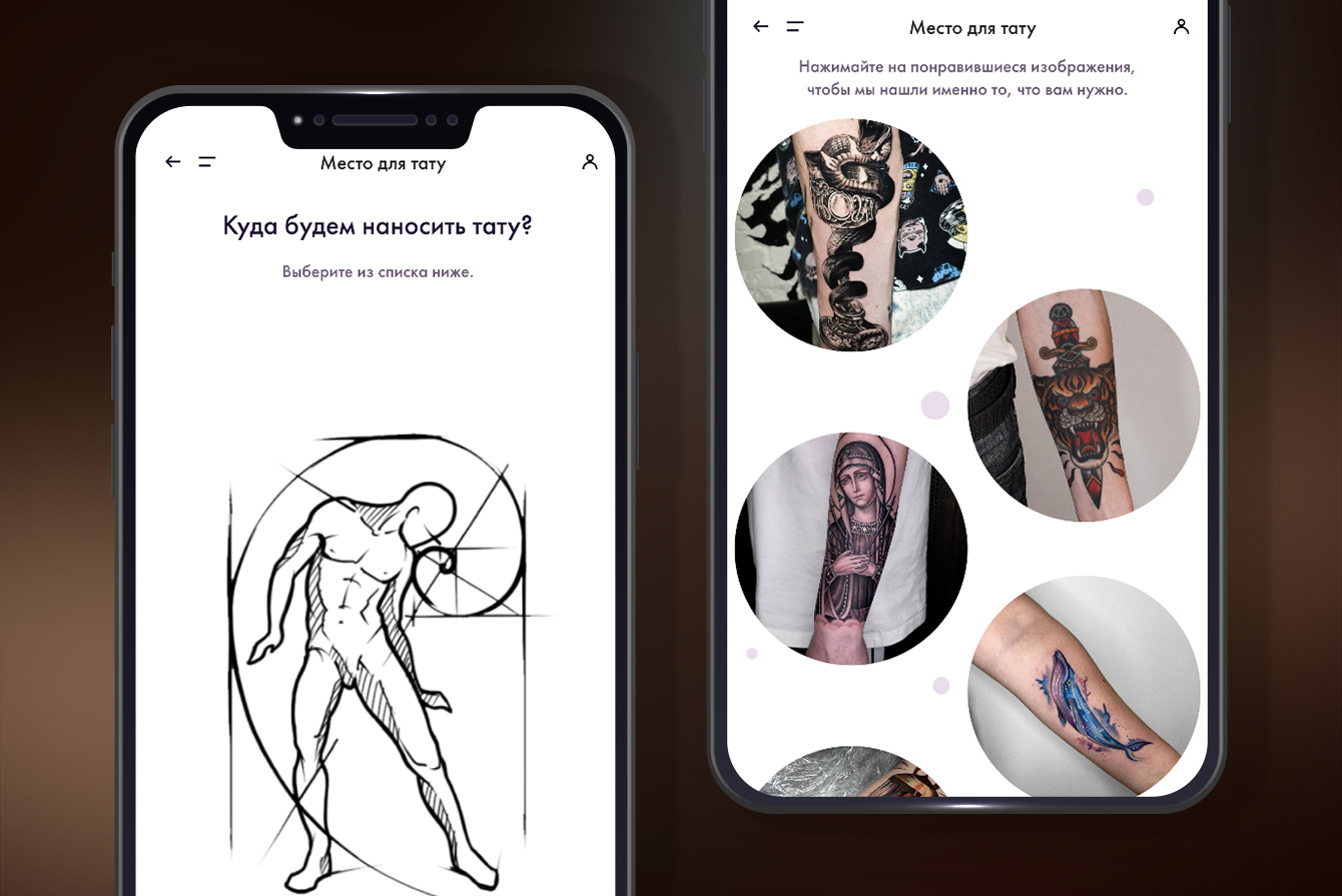 Бо́льшая часть наших усилий была направлена на создание понятного и эффективного алгоритма, который поможет пользователю легко определиться со стилем тату, местом нанесения рисунка и, в итоге, найти подходящего мастера. Одним из самых эффективных инструментов для этого стал интерактивный тест, который позволяет выбрать несколько понравившихся вариантов тату, после чего система определяет, какой стиль подходит именно этому пользователю, и рекомендует тату-мастеров поблизости.