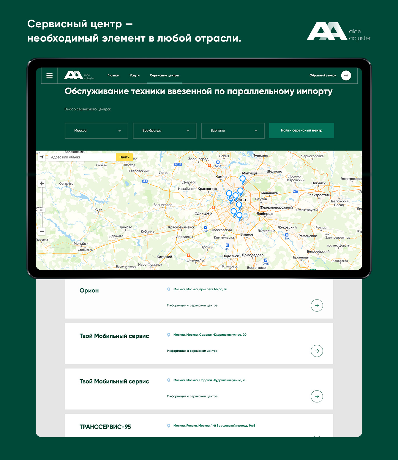 При выборе определенных параметров на сайте пользователи видят список сервисных центров, которые могут оказать необходимые услуги.