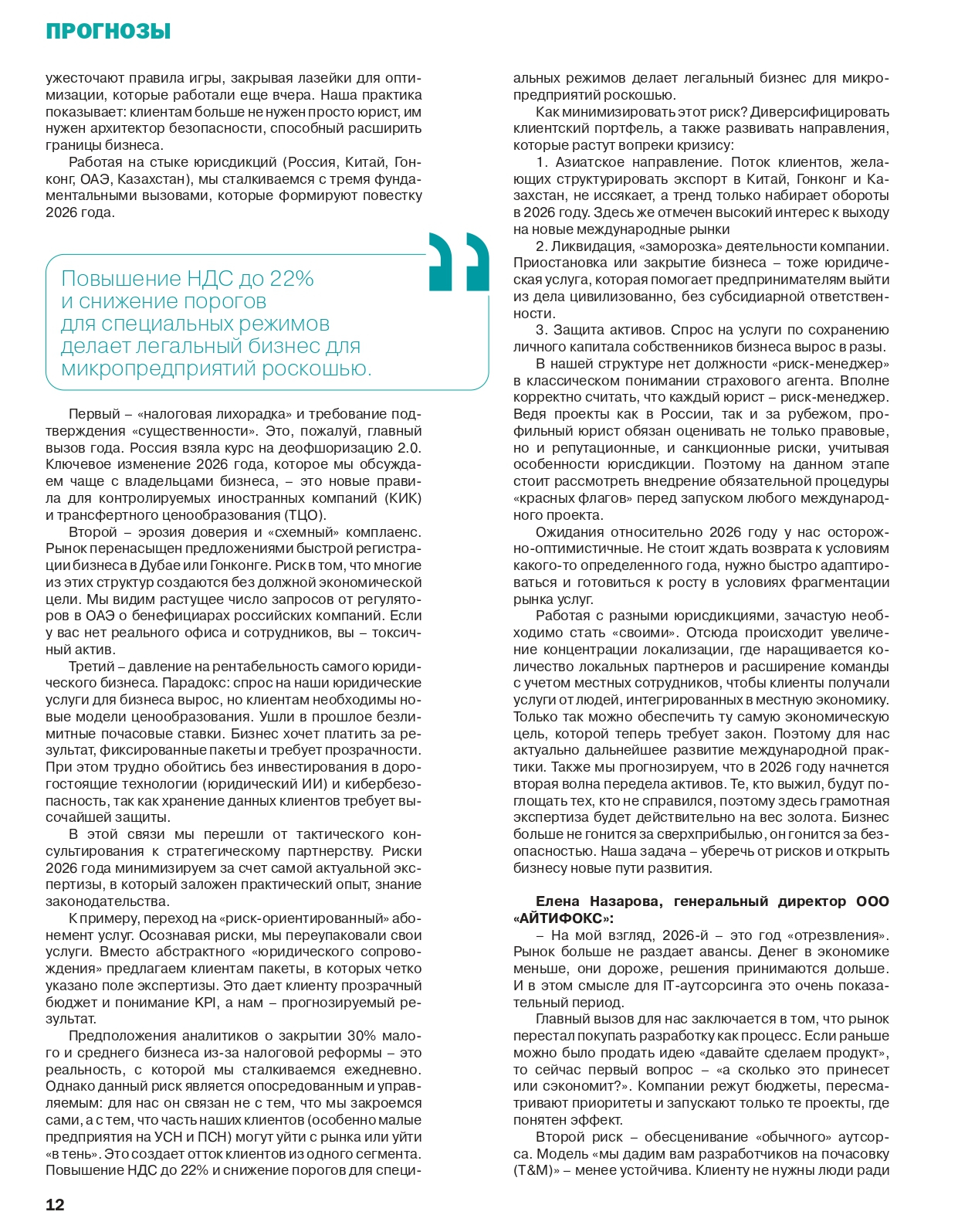 Вышел свежий прогностический обзор от «ГлобалМедиа», где эксперты ведущих компаний страны — от IT до девелопмента и торговли — делятся своим видением предстоящего года. В числе ключевых экспертов исследования — генеральный директор АЙТИФОКС Елена Назарова.