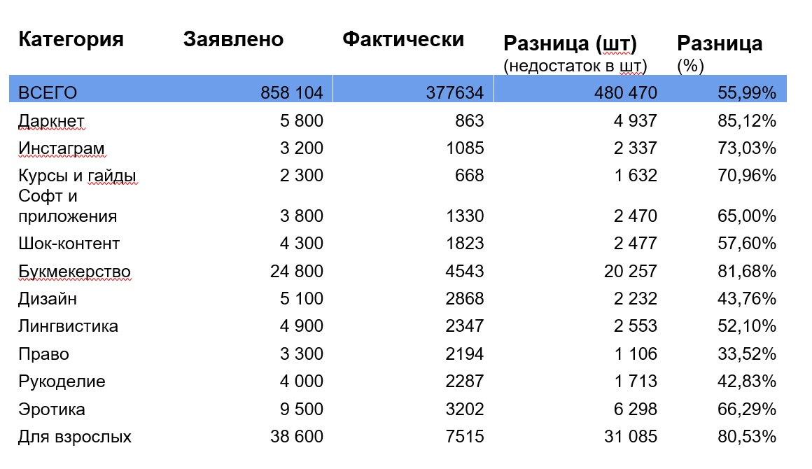 - «Для взрослых» - 7515 каналов против заявленных 38 600 (более 80% несоответствий).