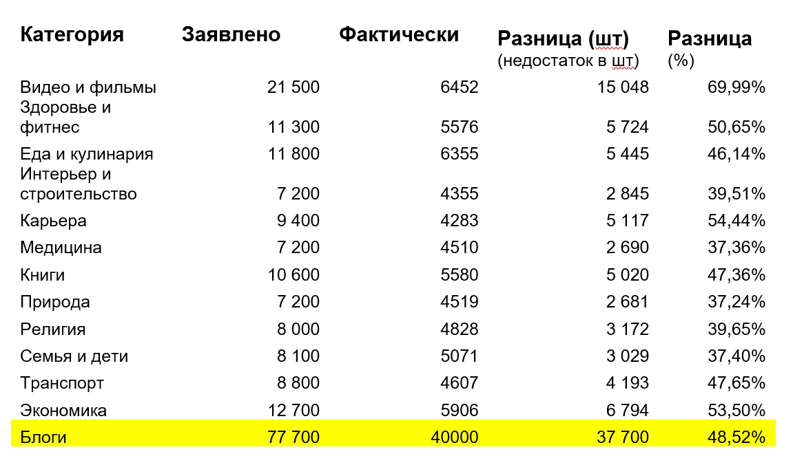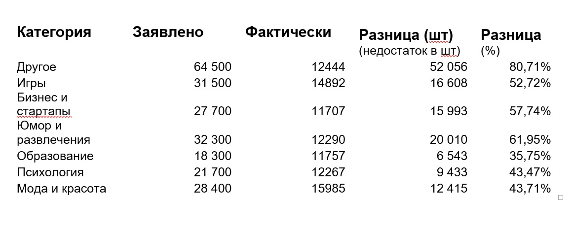 - «Букмекерство» - 4543 канала против заявленных 24800 (свыше 81% несоответствий);