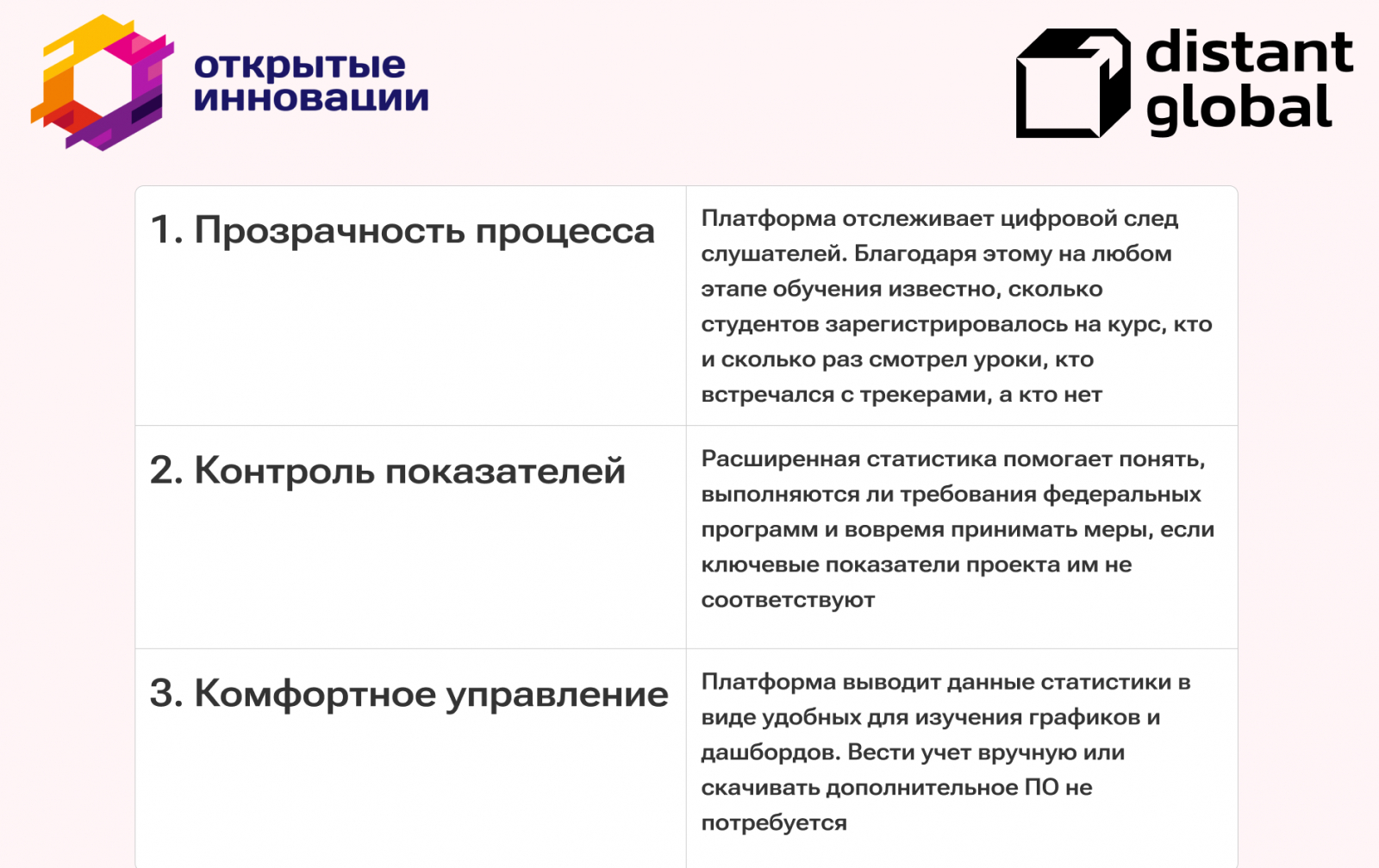 Еще одним важным условием для проведения акселерационных программ является возможность вести подробную статистику на платформе. Для этого организаторам требуется гибкий инструмент. Статистика на Distant Global расширенная, как в цифровом университете, и собирается автоматически. С ее помощью университеты одновременно закрывают сразу три задачи.