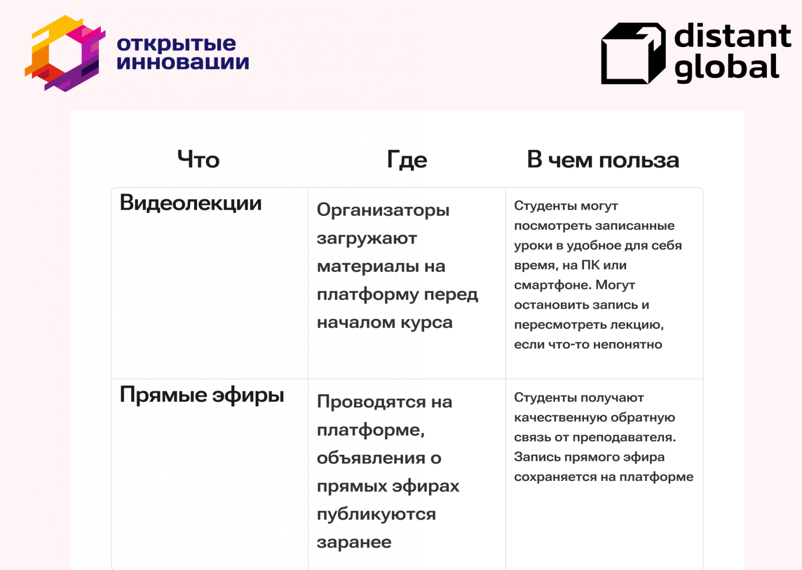 «Сочетание онлайн и офлайн-уроков на платформе помогает методологам добиться ощутимых результатов в обучении. При внимательном просмотре видеолекций и регулярном посещении прямых эфиров и очных практик, студенты глубже погружаются в процесс создания стартап-проектов. В целом использование цифровых платформ на 25% повышает вовлеченность слушателей в обучение, согласно данным зарубежных исследователей».