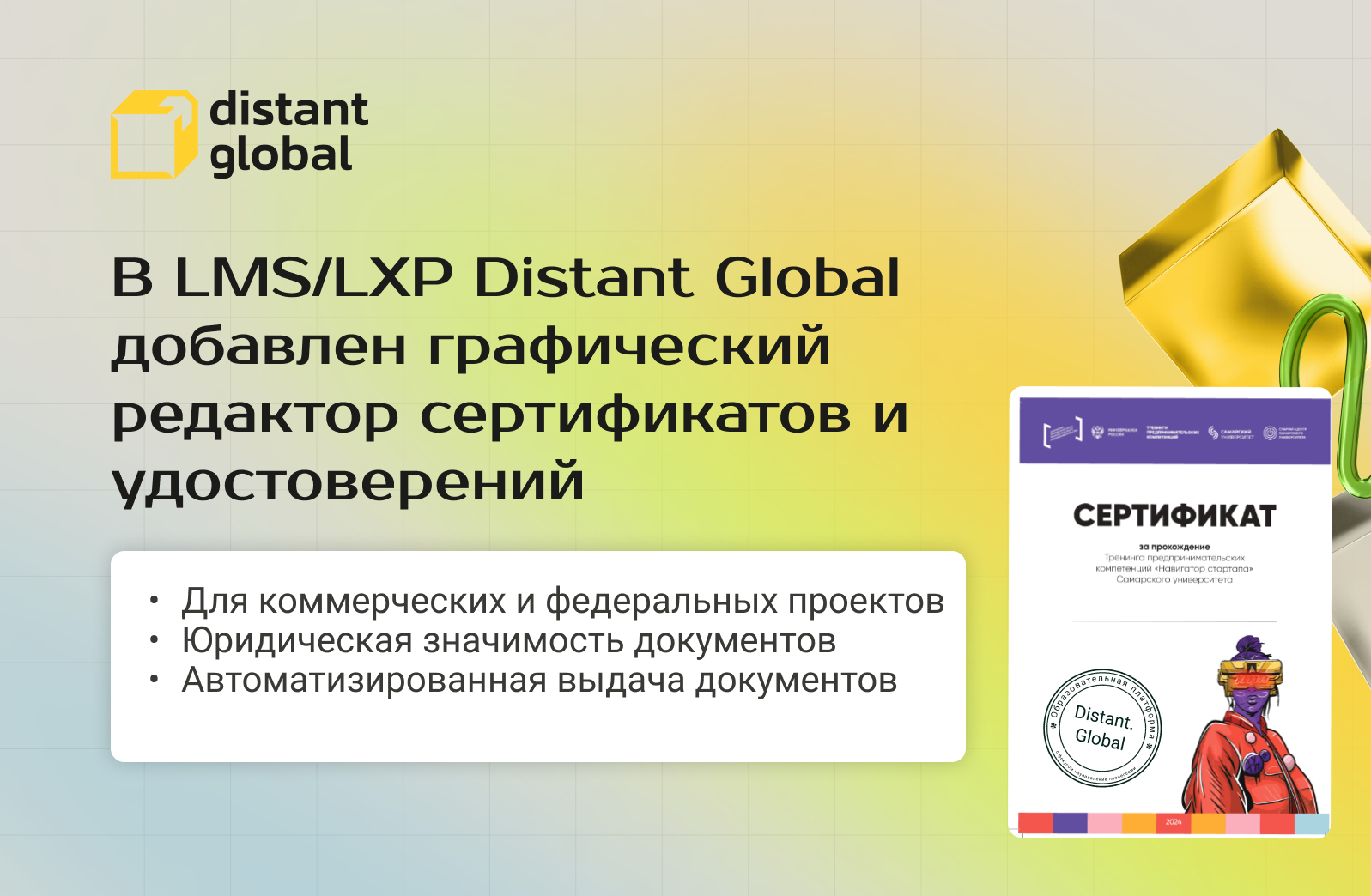 Массовая рассылка сертификатов — незаменимый элемент образовательной платформы, когда речь заходит о большом потоке слушателей, характерном для федеральных проектов. При этом важно контролировать документооборот. Организация, которая выдает «корочки» всем подряд, даже тем, кто не окончил обучение, теряет доверие слушателей. Добавление в LMS/LXP Distant Global графического редактора автоматизирует документооборот, что снижает вероятность ошибки при выдаче документов из-за человеческого фактора.