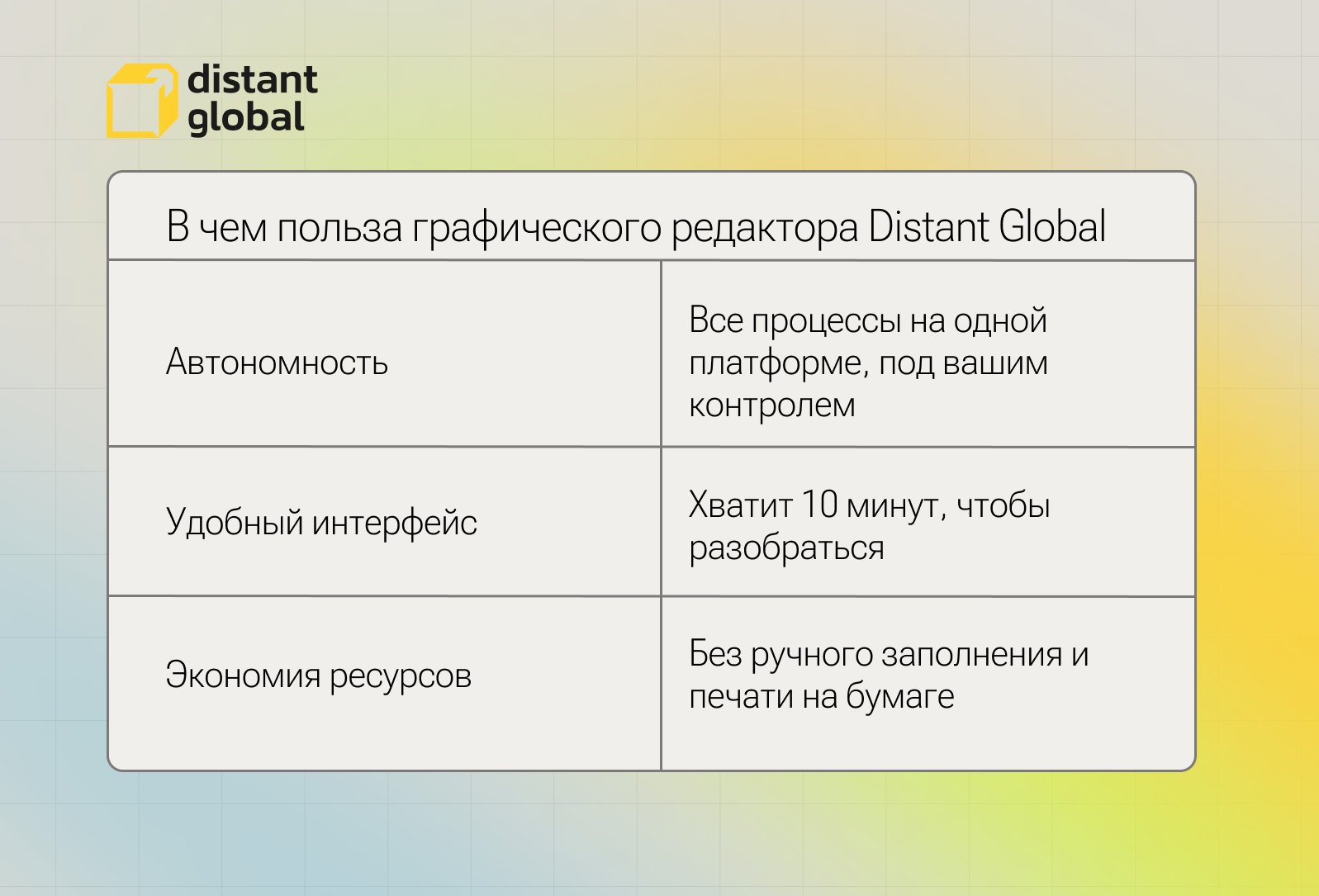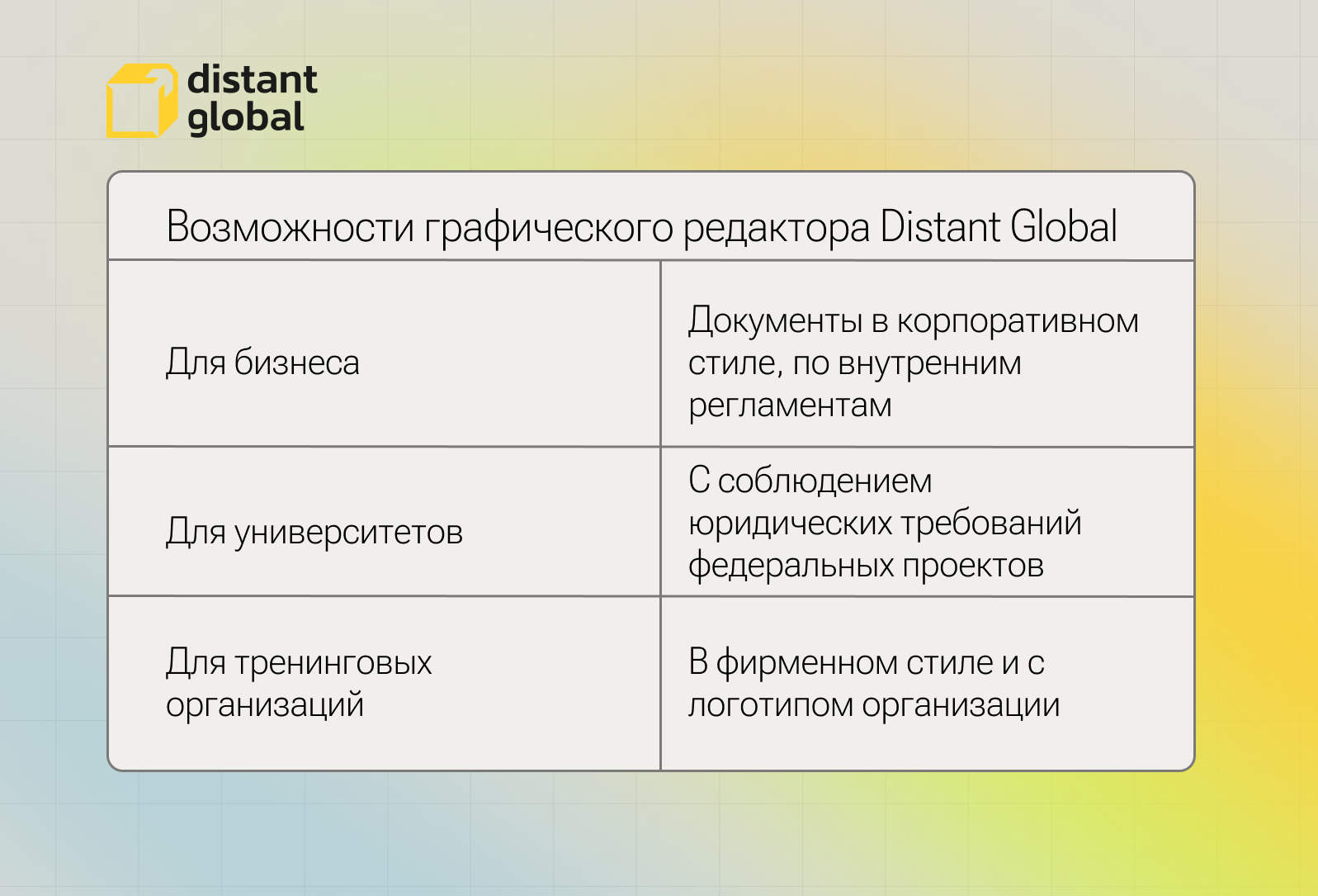 Еще один момент — с помощью графического редактора платформы Distant Global легко создать шаблон, который соответствует необходимым юридическим требованиям образовательного проекта.
