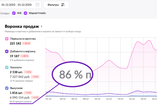 За 2023 год я — основатель компании Максим Воробьев, вместе с командой и 70 партнерами сделали оборот в 2,5 млрд. И абсолютно у каждого нашего селлера % выкупа стабильно держится в районе 85-90%.