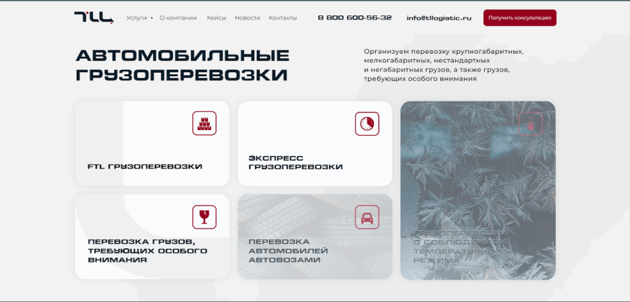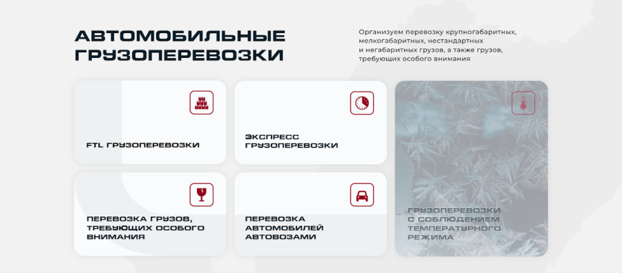 Мы хотели сделать сайт лаконичным и строгим, без лишних изображений, которые бы вносили шум в дизайн. Однако заказчик просил добавить фотографий, и мы решили пойти ему навстречу. Правда, с некоторыми оговорками: вместо того, чтобы снабдить раздел «Услуги» фотографиями огромных тягачей, мы сделали ховер-эффект с фактурами. Например, морозные узоры иллюстрируют термоперевозки, а протекторы шин — перевозки автомобилей. Так мы выполнили пожелание клиента, но при этом не потеряли лаконичность.