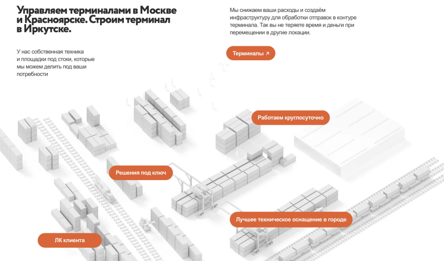 Фотографии терминала и контейнеров для сайта делал фотограф по запросу заказчика в суровый красноярский мороз. Долго так мучить человека мы не могли, поэтому сделали 3D-иллюстрацию транспортного терминала. Контейнеры на ней мы расставляли в режиме реального времени, общаясь с заказчиком по телефону и следуя его указаниям.