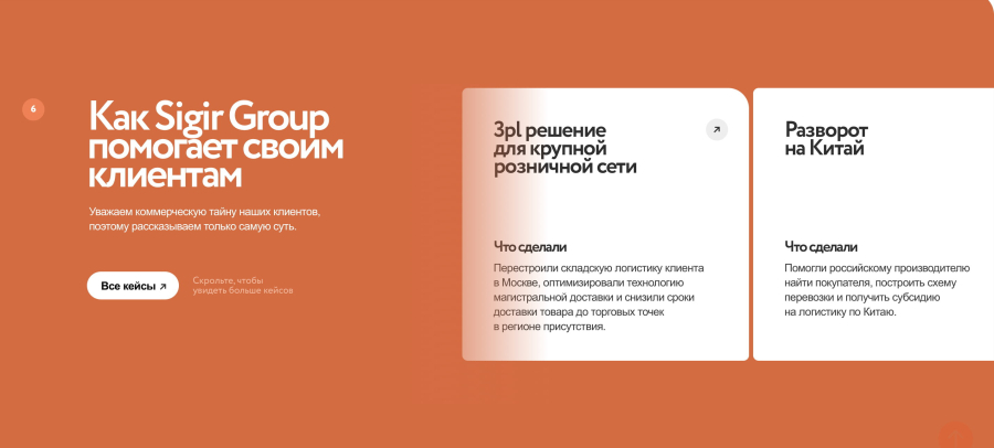 Компании «Восток Логистик» и Sigir не первый год на рынке, и за это время обросли опытом и сформировали специализацию. Например, для «Восток Логистик» в разделе «Услуги» мы подчеркнули разнообразие видов перевозок: ж/д, море, авиа, наличие собственного автопарка и складов, а также своих агентов в Китае. Sigir во главу угла ставит комплексные решения — 3pl-логистику, а также наличие собственной сети контейнерных терминалов и опыт, выраженный в кейсах.