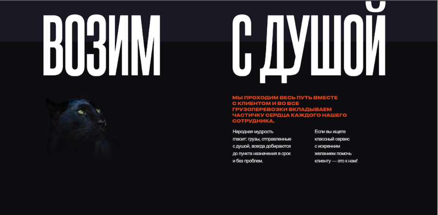 В коммуникации мы подчеркнули tone of voice компании: свойский, душевный, компанейский, с юмором. Он отражается в заголовках и текстовых блоках: «С нами все путем», «Возим с душой», «Доставляем грузы по РФ и миру и не доставляем проблем».