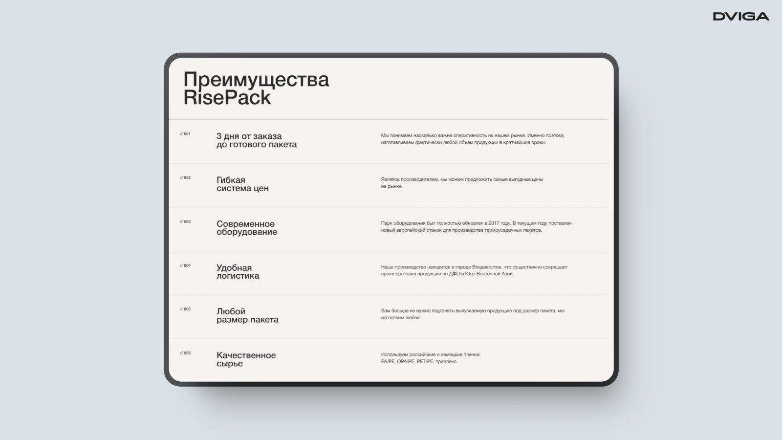 Например, вот так выглядят преимущества на главной странице одного из моих клиентов — предприятия RisePack. Компания занимается производством упаковочных материалов.