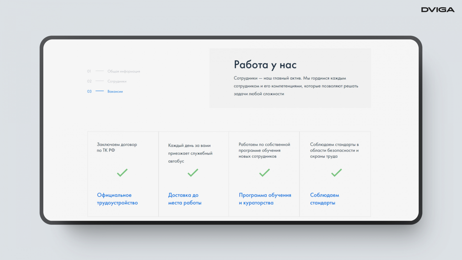 На сайте компании мы с коллегами сделали раздел с вакансиями, в котором перед предложениями о работе собраны главные фишки для сотрудников предприятия. Такая прозрачность помогает превратить соискателя в лояльного специалиста.