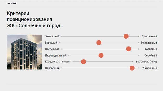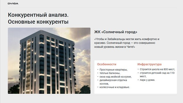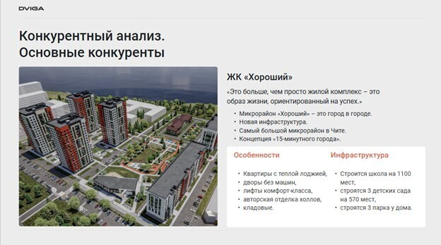 Мы проанализировали, как конкуренты взаимодействуют с аудиторией, на чем они делают акцент и какие у них рекламные посылы. Выяснили, что на рынке у всех «плюс-минус» одинаково, у большинства нет четкого позиционирования. Основными конкурентами являются ЖК «Солнечный город» и ЖК «Хороший».