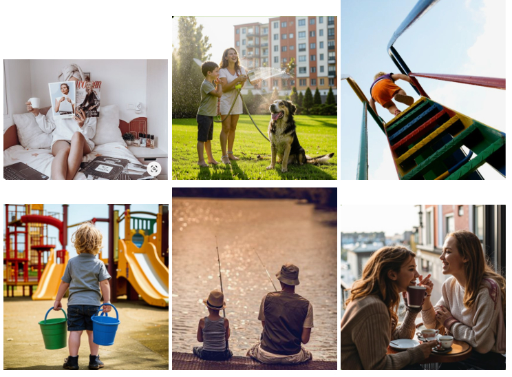 В каждом изображении мы показали один ключевой момент, который создаёт настроение: радостная сцена с ребёнком, играющим на площадке, вечер с пледом и фильмом, готовка на кухне с лёгким беспорядком, когда все заняты одним делом. Это образы, которые легко вызывают эмоции и ассоциируются с гармонией и спокойствием.