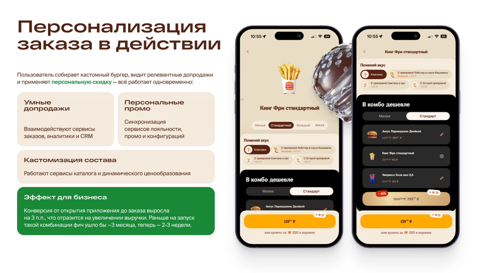 Мобильное приложение Бургер Кинг — один из ключевых каналов продаж крупнейшей сети ресторанов быстрого питания в России. Оно входит в топ App Store и Google Play, обслуживает свыше 1 млн пользователей в день и генерирует прямую выручку, лояльность и контакты с аудиторией.