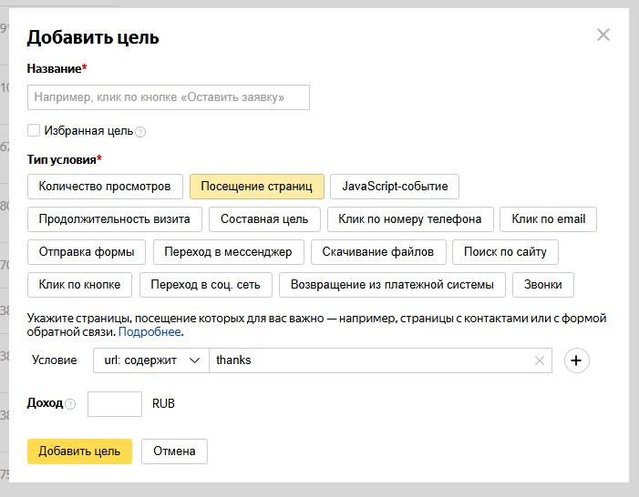 Этот вариант удобен, если после действия пользователь попадает на отдельный адрес (например, «/thanks»). Тогда как добавить цель в Яндекс Метрике максимально просто: выбираете условие по URL и указываете нужную страницу — это быстрый способ сделать цель в Яндекс Метрике без разработки.