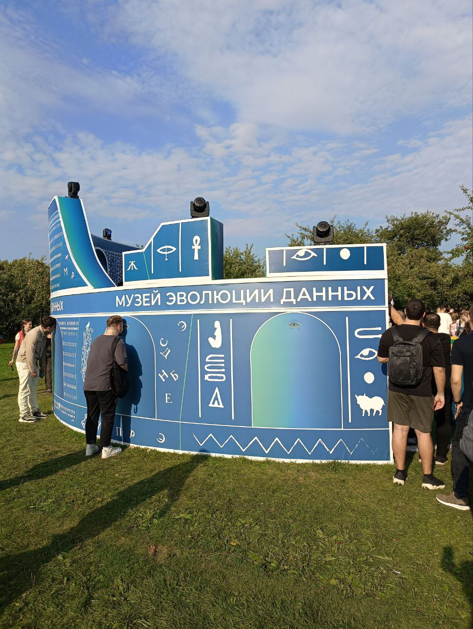 Колизей — один из античных памятников, и, затрагивая тему древности, мы придумали музей данных, где показали эволюцию представления и хранения информации. Заглянув в окошки по периметру стенда, посетители могли увидеть артефакты, связанные с хранением данных: от глиняных табличек до современных носителей.