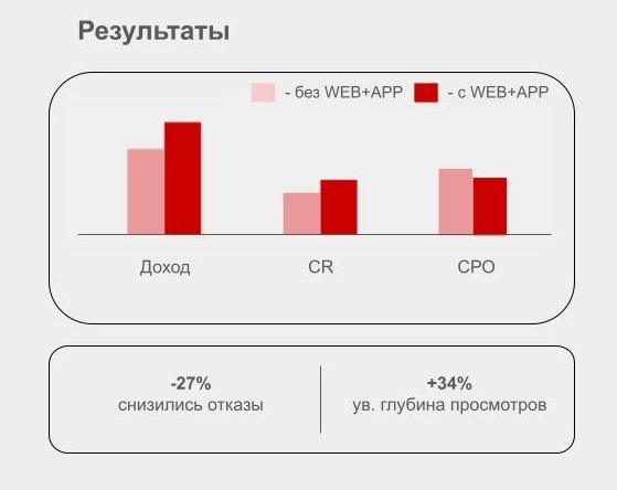 Еще один плюс - использование сценария Web+App принесло дополнительный объем данных для обучения рекламных кампаний. Смогли получить 41% дополнительного дохода.